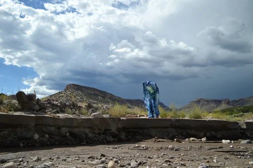 Happy Mountain is the artistic collaboration between Christopher Bratton and Lindsey Fromm. Their series Spirit Travel began in May 2014 during a hike through the charred and flood-carved landscape below Horn Mesa in Northern New Mexico. The draped figure in each image exists in the mythic realm, a space between the ancient and the ephemeral. The figure begs the question: How does the corporeal body connect with the human spirit? We think when the wind drifts and whips the veil, a bridge is created to the sacred realm.
