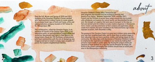 Over the Fall, Winter and Spring of 2020 and 2021, I worked with students at the Elevation Children’s Center to create artwork for an empty street sign at Field and Frame, a film and video production company located at 107 Tulane Dr. SE, Albuquerque, NM.